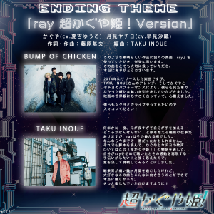 本作のエンディングテーマを飾るのは、「ray 超かぐや姫!Version」。日本を代表するロックバンドBUMP OF CHICKENが初のフィーチャリング・アーティストとして初音ミクを迎えたことで大きな話題を呼んだ名曲「ray」を、数々の人気ゲームやアーティストの楽曲を生み出してきたTAKU INOUEが新規アレンジを手掛けた一曲。