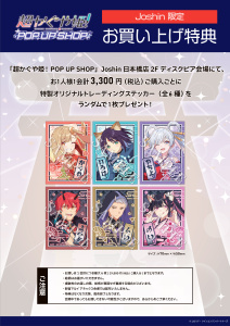 新宿マルイ アネックスでは「トレーディングカード(全6種)」、Joshin日本橋店では「トレーディングステッカー(全6種)」をそれぞれお渡しいたします。